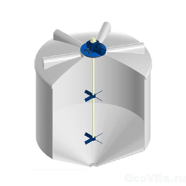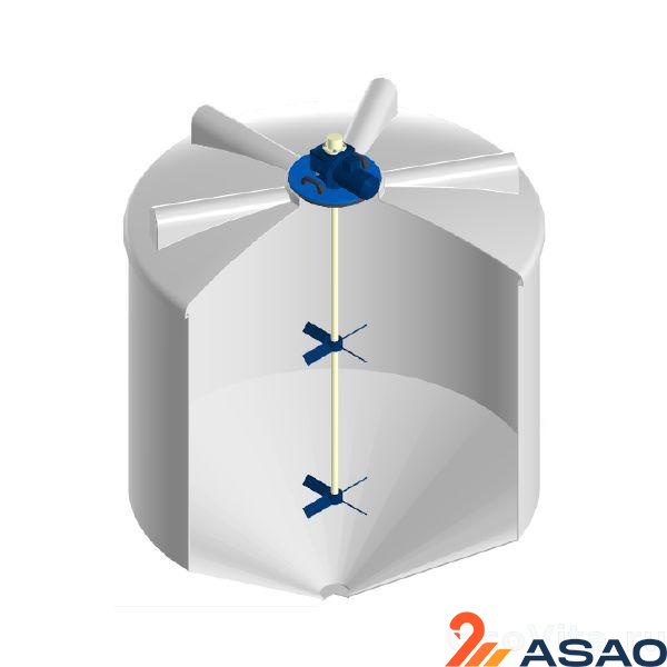 Лопастной тихоходный двухярусный миксер Asterion серии Микс L для емкости Экопром ФМ 5000. Конструкция миксера включает в себя два четырехлопастных пропеллера, вал, привод, жесткое крепление мешалки к валу привода. Используется для перемешивания растворов кислот и щелочей и устанавливаются на емкость.